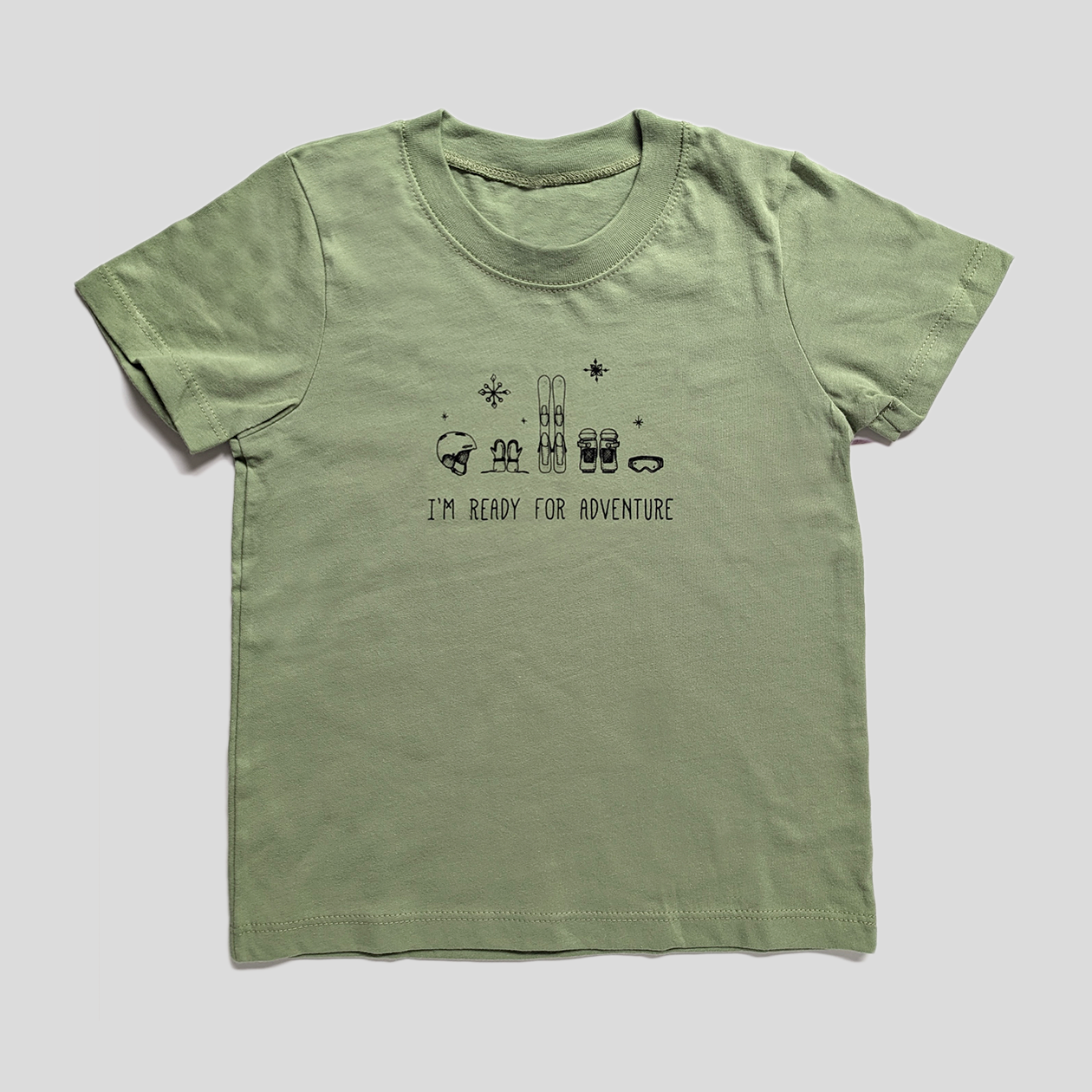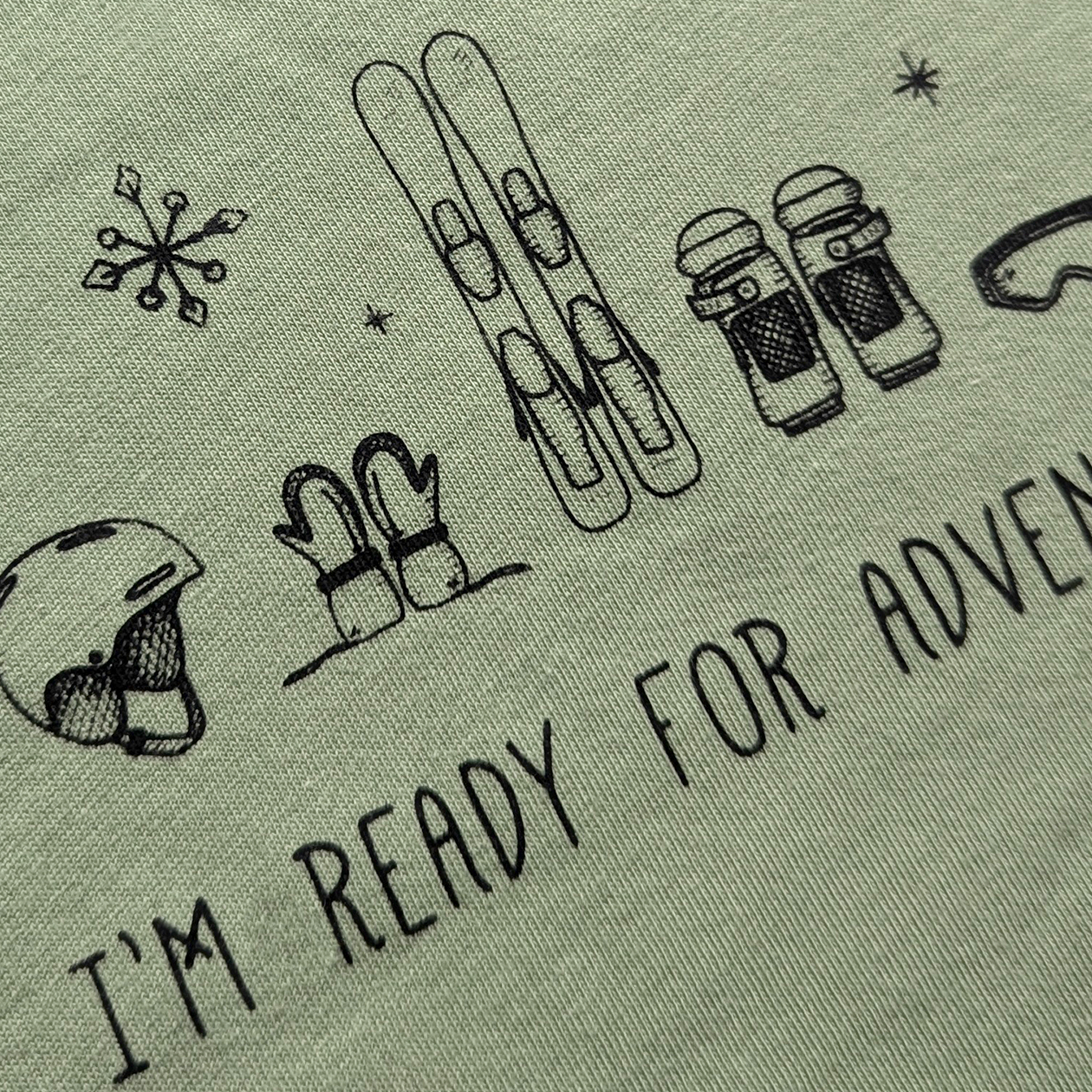 Is there future skier in your life? This soft, organic cotton tee shirt features a cute illustration screen-printed on the front. The "I'm Ready for Adventure" tee shirt comes in two colors with the Sherpa Ant logo printed on the back collar.